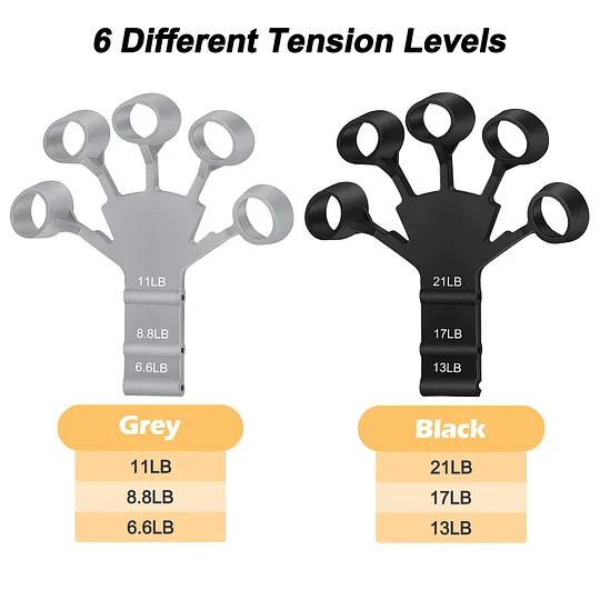 6 Resistant Levels to Choose from】Silicone Guitar Finger Exerciser provides you with 6 levels of resistant levels, including 6.6LB, 8.8LB, 11LB, 13LB, 17LB, and 21LB. You can choose the appropriate level according to your grip strength.